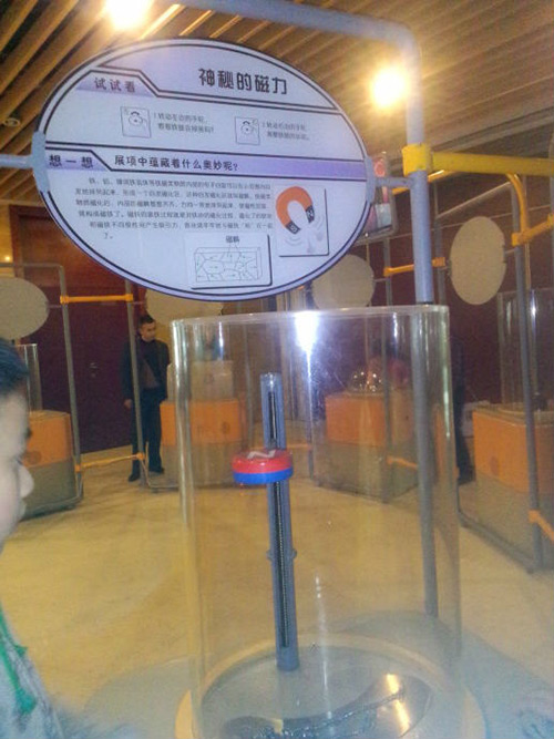 通过趣味性的互动,展示磁力的知识。当参与者调整磁铁与铁链之间距离的时候,看到磁铁与铁链的吸引和分离,感觉到磁场的存在,以及对磁力的大小有一个认知。